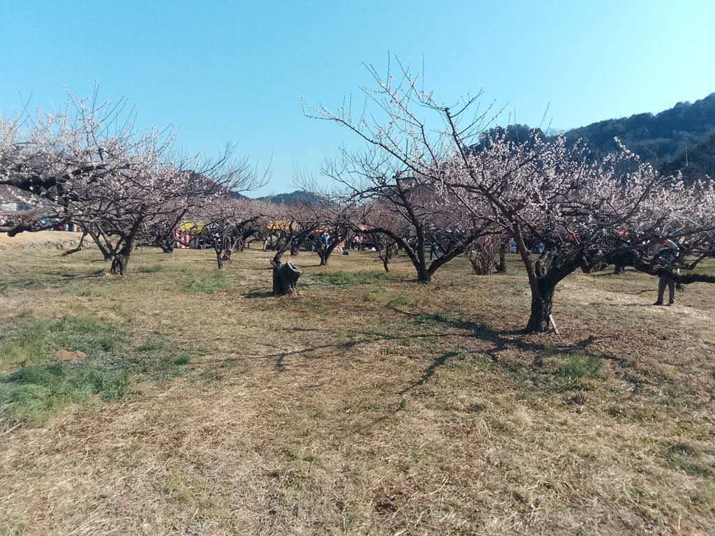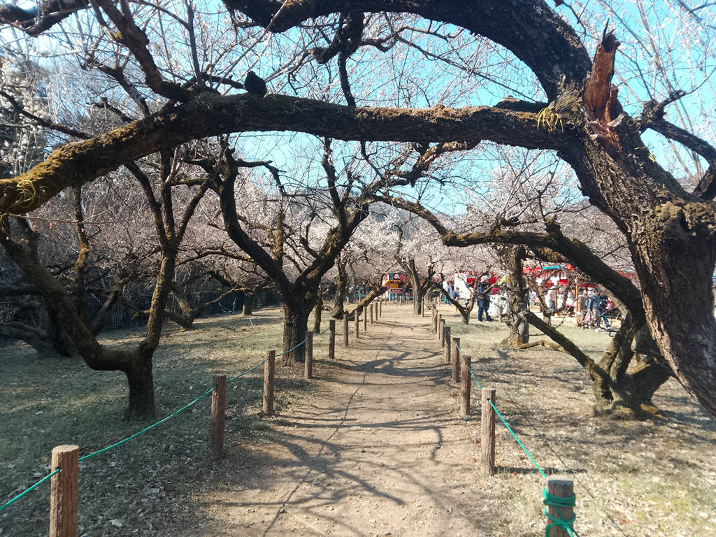 さらに奥へ行けば、まだ芽吹いていない梅が大量にあります。入り口ほどの派手さはないが、人が少なくゆっくりと撮影ができます。シートを敷いて花見している方々もちらほら。