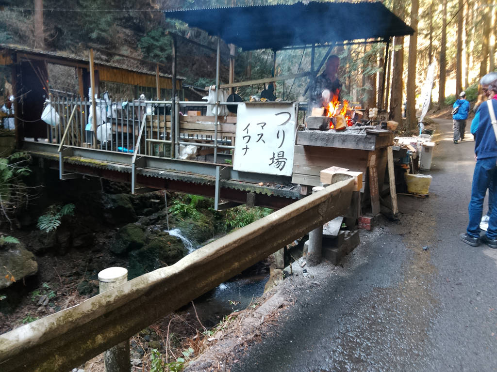おお、マスとイワナの炭火焼きを売っている。お金(現金)を持っていたら絶対に買って食していたと思う。さきほどの越生梅林で、なけなしの千円を半分使ってしまったため、持ち合わせがないのです。現金は忘れないようにと毎回たしなめているのに、この日は短距離だからと油断しました。