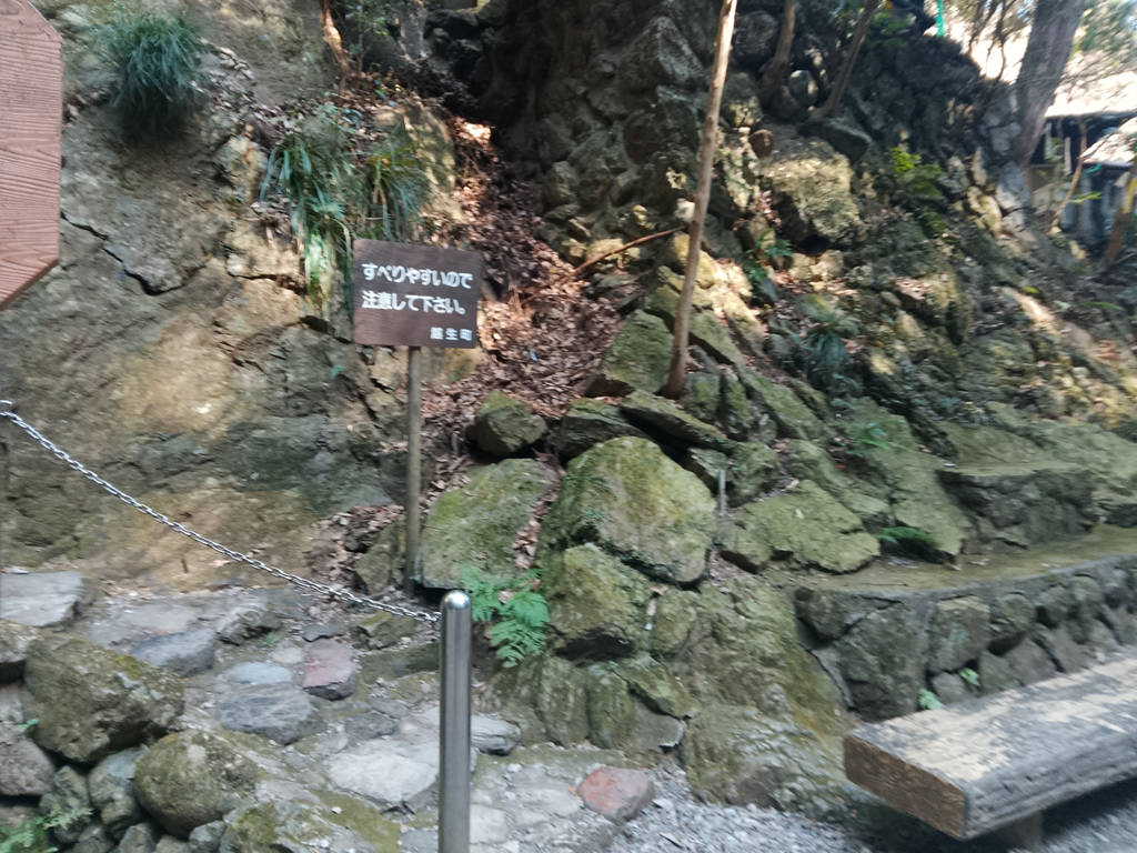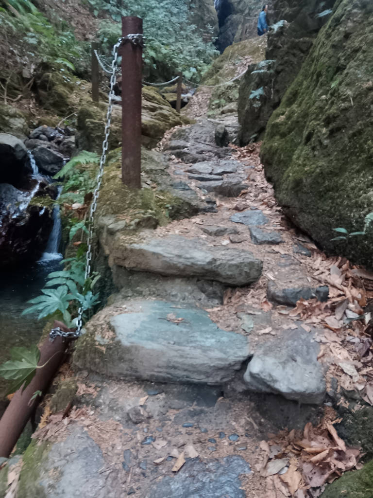 ここも、こんな感じの岩階段を登らねば滝を拝めない。ビンディングを履いてない人には分からないが、まるでガラスの靴のように滑るんだ、これが。特にこうした石の上とか、木の橋の上ね。ずるりと滑ったよ、やはり。