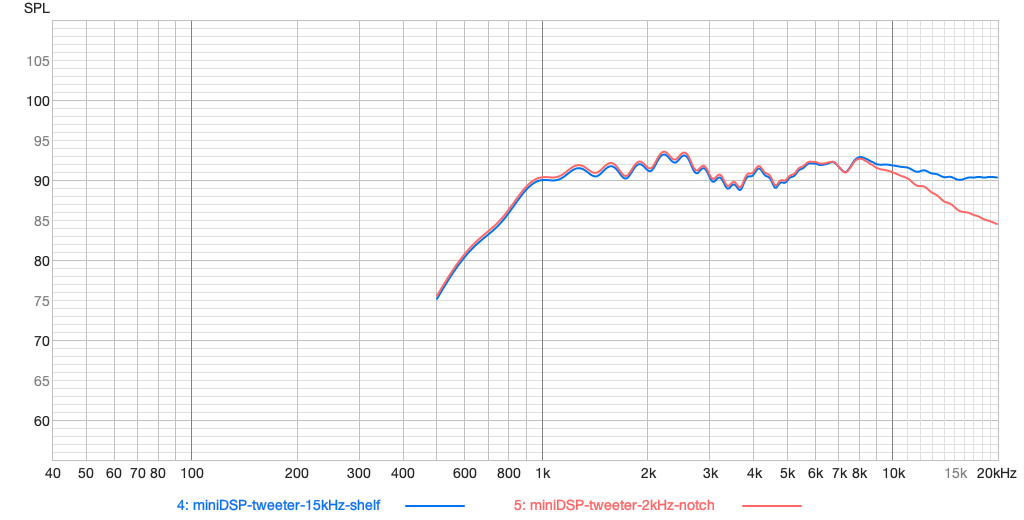 15kHzのシェルフで補正してみます。赤が補償前。青が補正後。