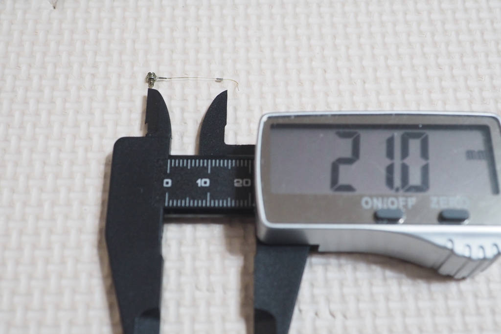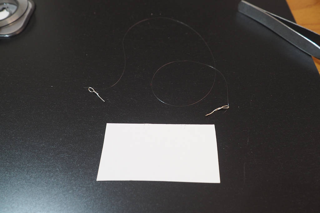 「背景が黒だとかろうじて目視できるが」、「背景が指(肌色)だと見えなくなる」そのくらい細い。これは老眼だからではないです。私は裸眼だと近視で視力にまったく困らないので。このため、わざわざ黒背景の作業台を用意して加工を行いました。