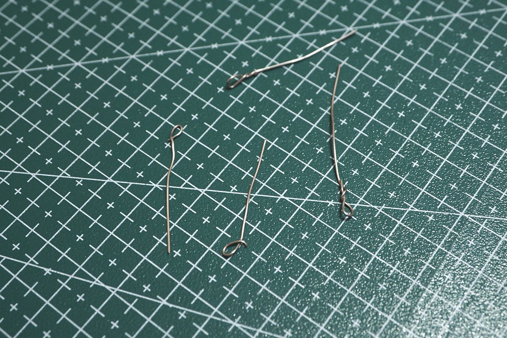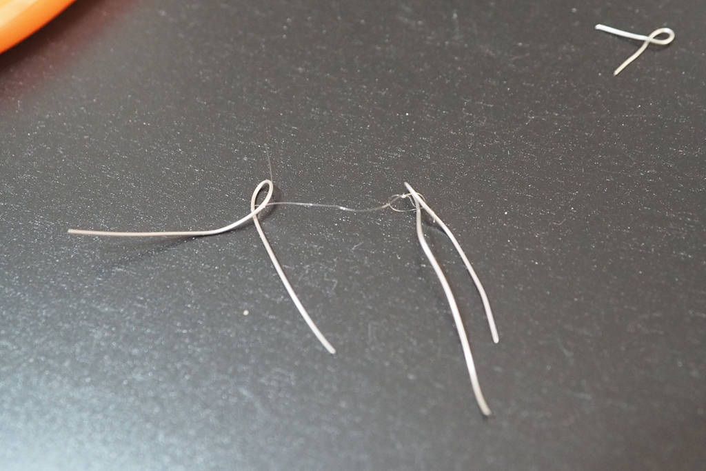 縫い針です。ステン針金を曲げて作ったもの。なにせ、この糸は「指でつまむ」ことさえ困難なのです。なにせ、ピンセットでつまんでもその爪先を擦り抜けてしまう、そのくらい細い。まして、「指先で結ぶ」のがかなり困難。この針を併用することで、不器用でも難なく結線を可能とします。