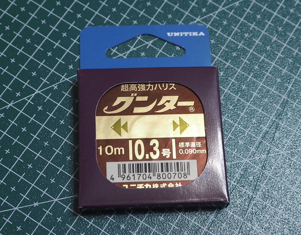 グンターの 0.3 号です。材質はナイロンで、太さは0.090mm。髪の毛よりも細く、目視が困難なくらい細いものです。どのくらい細いのかというと、
