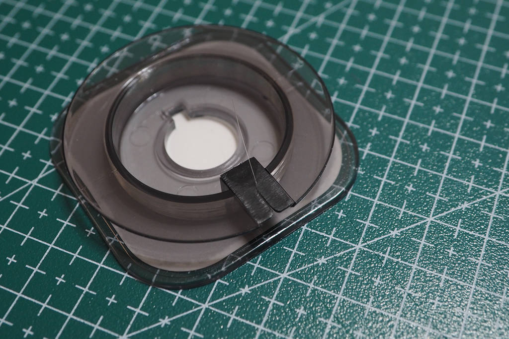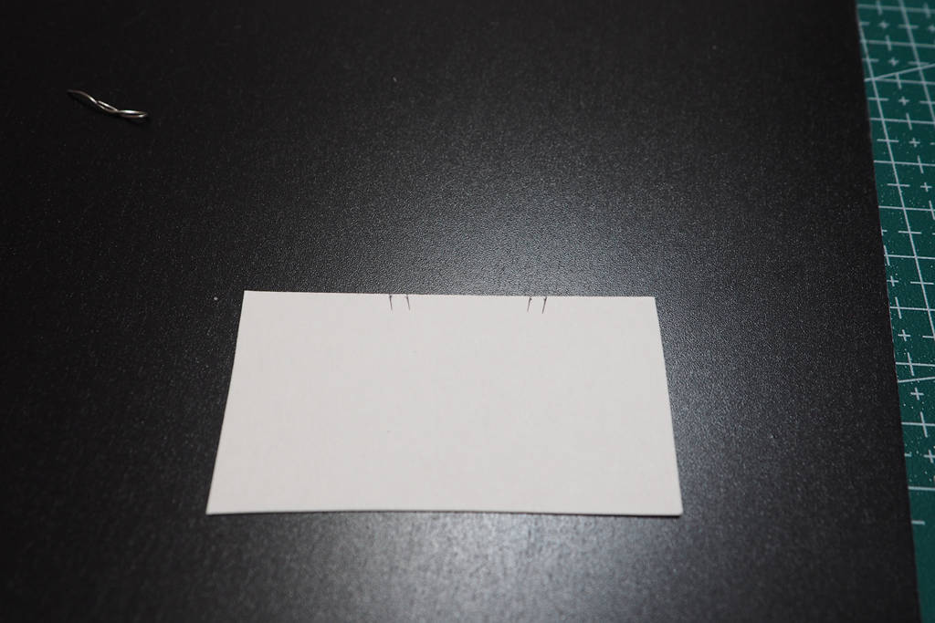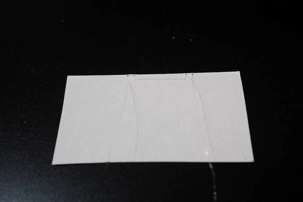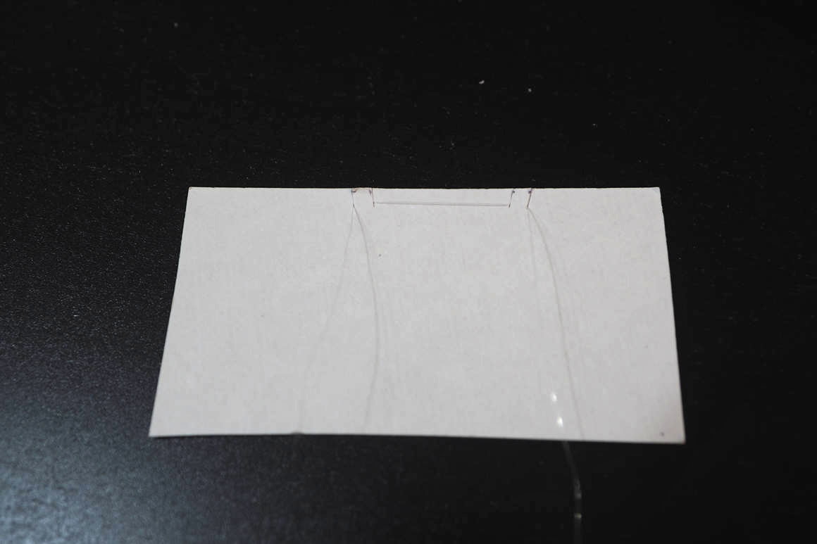 まずペーパー治具です。ボール紙にデザインナイフで切れ目を入れたもの。これが寸法出し、かつ巻きつけの仮リールとして働きます。大きく見えるかもしれませんが、これで幅が6cmくらいの非常に小さな紙です。