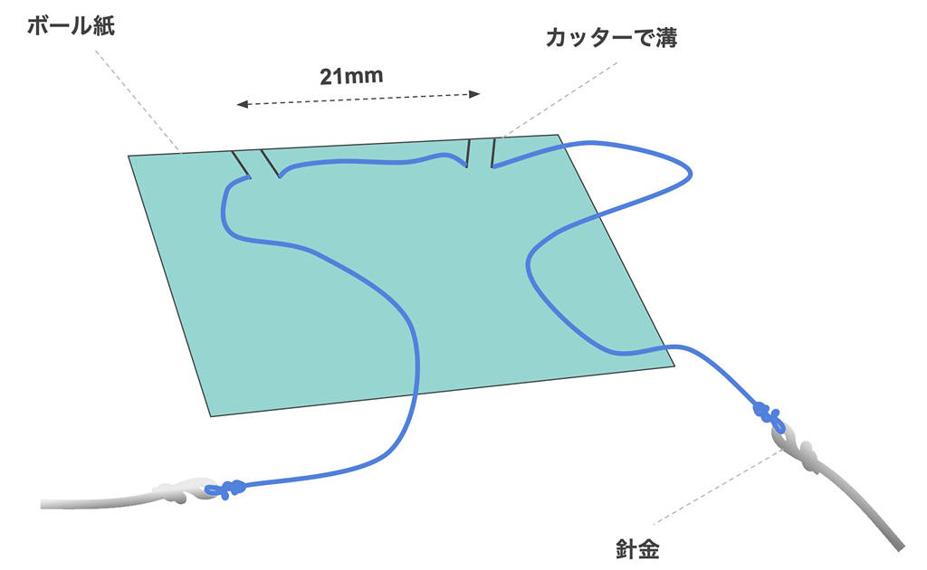 こんな風にボール紙へ糸を通し、終端を結線します。