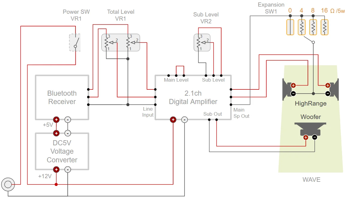 この回路図例では [Expansion SW1] にてハイレンジドライバの拡がり率と音量を調整しています。とても特殊な工夫に見えるかもしれませんが、スマホ/PCのオーディオICなんかには、似た仕掛けが最初から内蔵されています。