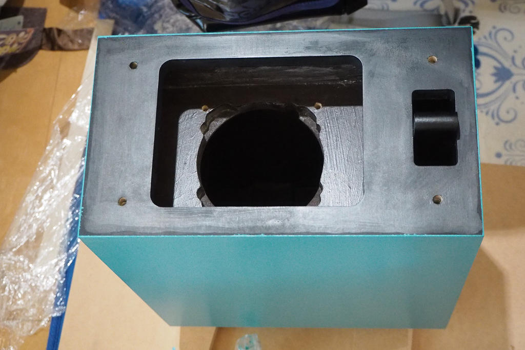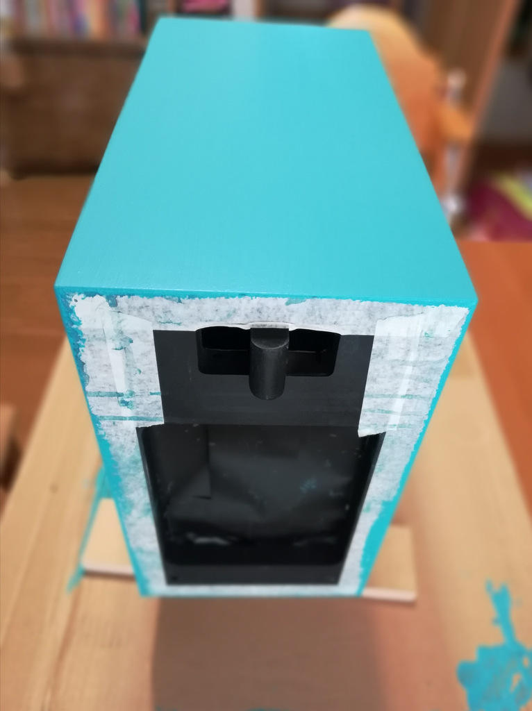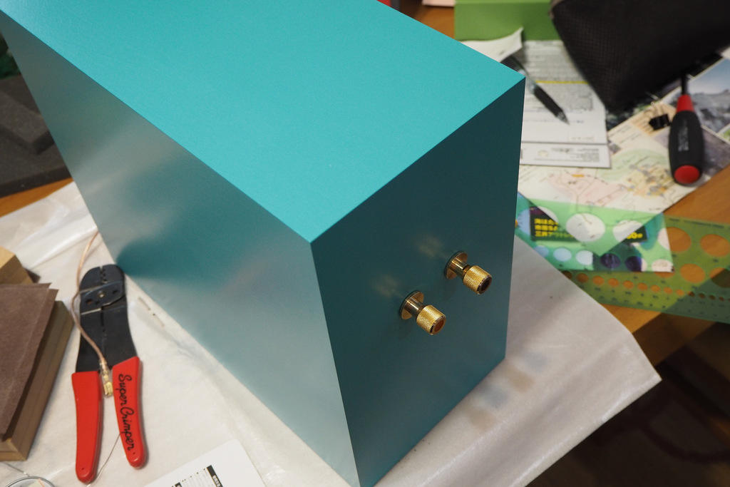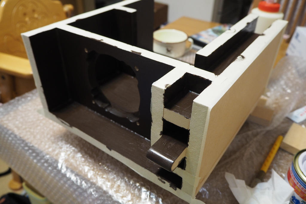 そして最終塗装=上塗りです。サブバッフルは掛からないようにマスキングして養生します。