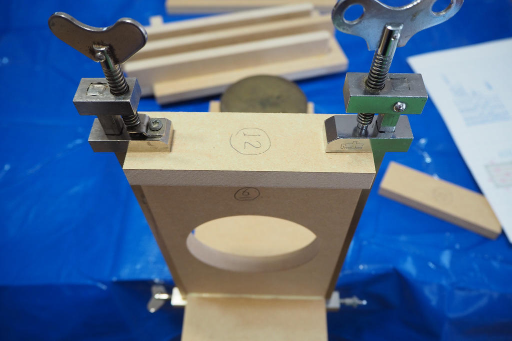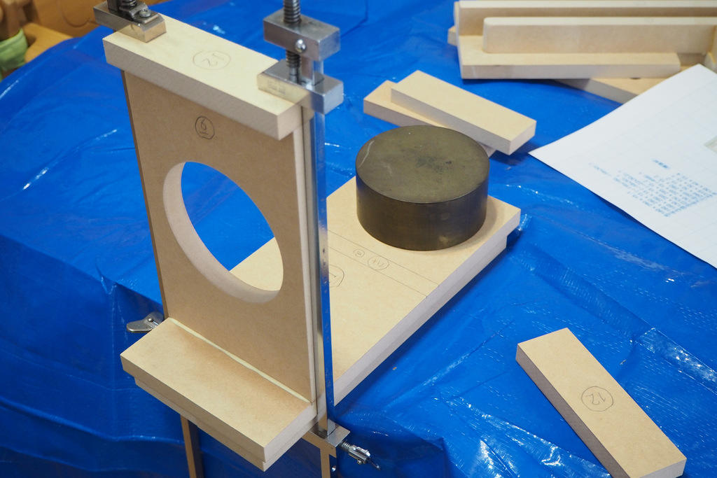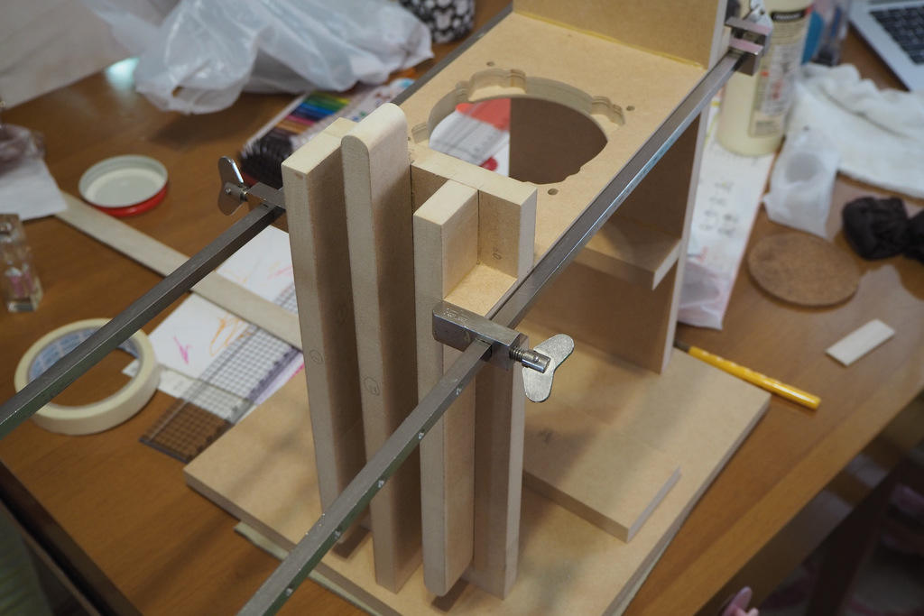 下に板などを敷き、水平と垂直を保って可能な限り正確に接着をしてください。ここが歪むと後工程が全て台無しになります。