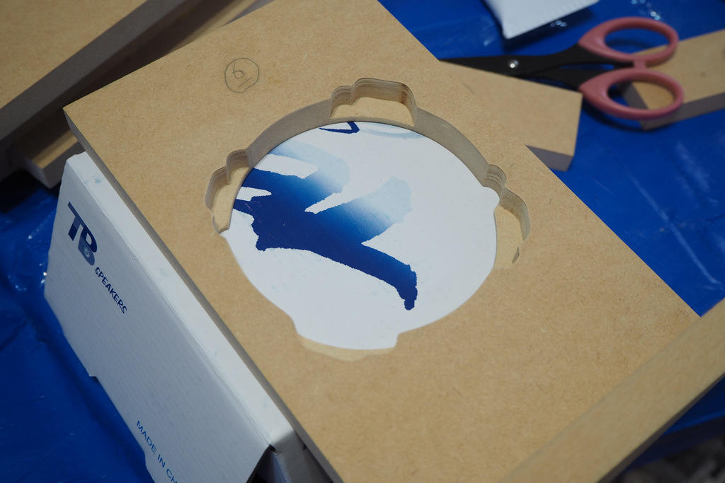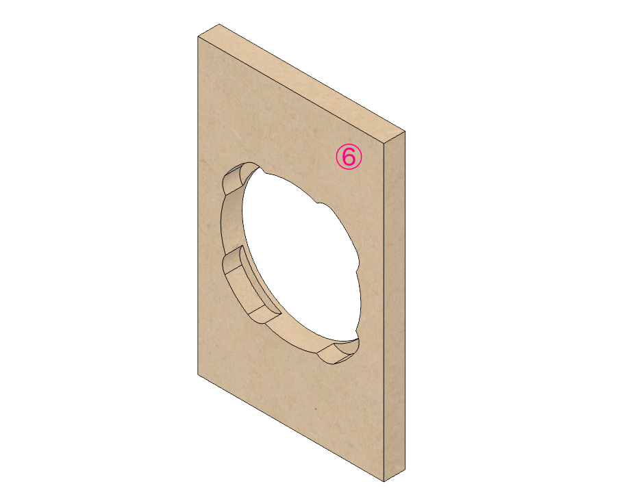 今回のウーファー、W3-2108はバスケットの裏面が特殊でデコボコした形状をしています。一般的ドライバーのような、単純丸穴ではインサートできないのです。このため、干渉する突起部をザグってやらなければなりません。これはフラッシュマウントともちょっと違います。少し厄介なフレーム形状ということ。