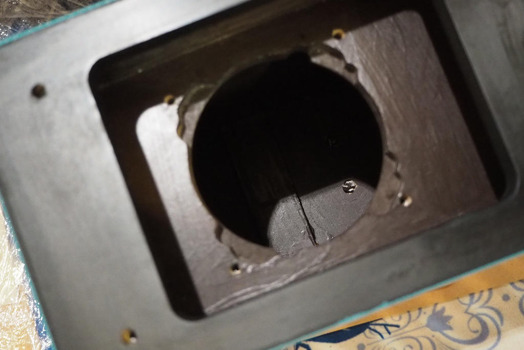 ウーファー取り付け部がご開帳。開口部が狭いから、ボルトナットでないと取り付け作業は厳しいと思います。力が入らない。