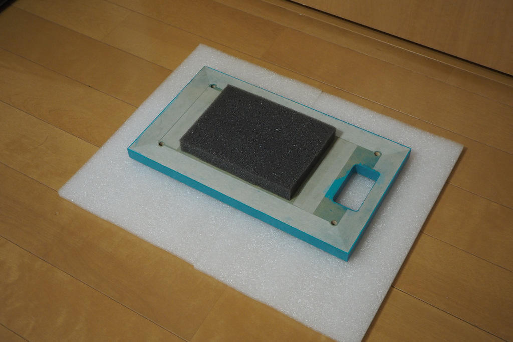 塗装の融着を防ぐ&密閉度を上げるため、裏面はマスキングテープが隙間なく貼られています。このまま接合します。中央部はウーファー直接波が当たる部分にウレタンを貼り込んでいます。