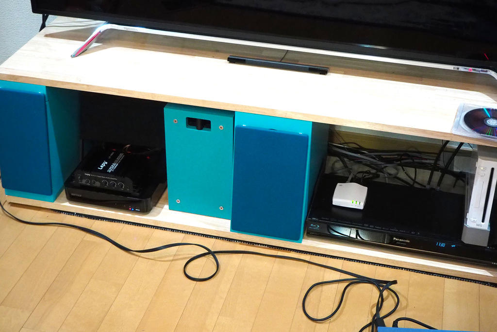 TVラックの隙間に滑り込ませる。ほとんど自由度がなく、最初から確保できる大きさと容積は決まっていました。