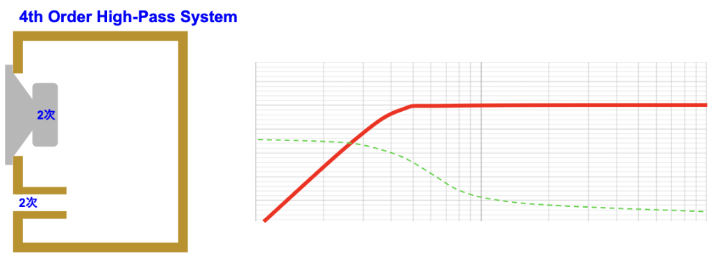 バスレフ方式の低域特性は、4次ハイパスフィルターの電気回路に線形近似できます。ドライバー(+箱)で1極。バスレフポートで1極。合計2極だからx2で4次系というわけです。