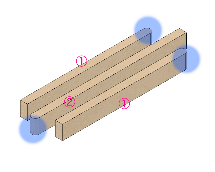 バスレフダクトを形成している部材1番と2番。その端面をR加工しておきます。
