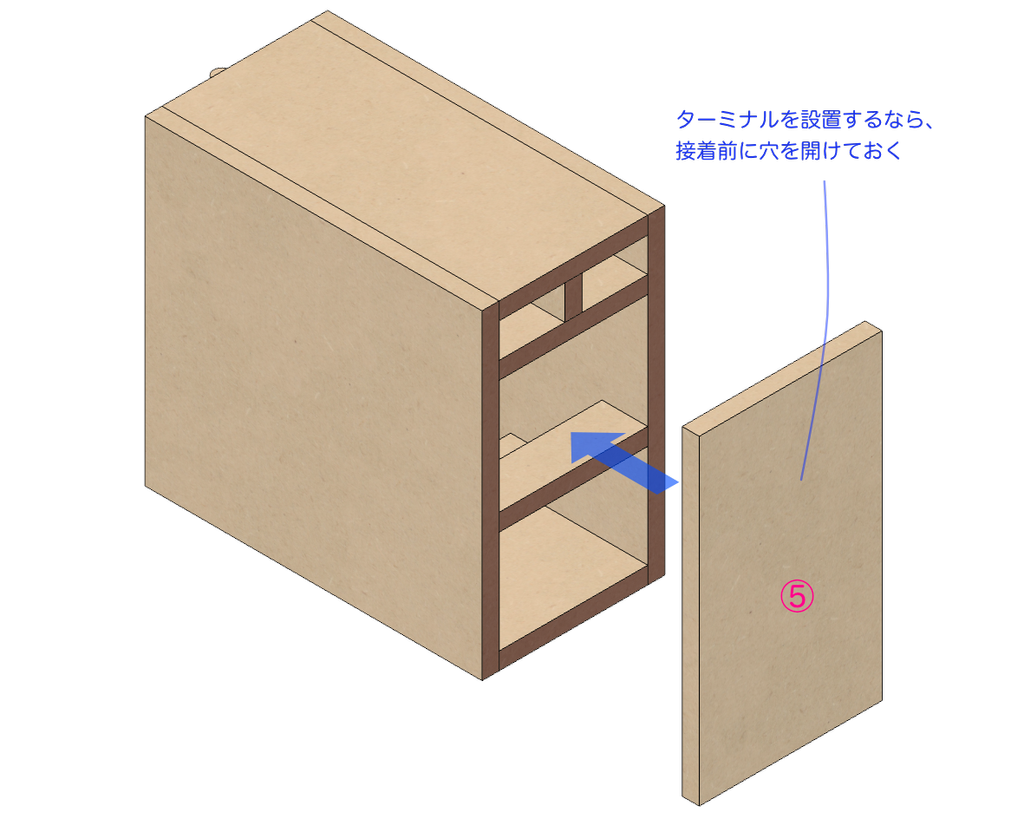 裏板5番にスピーカーターミナルを装着したい場合は予め穴を開けておきます。場所は任意。後から手を突っ込んでナットを回しやすい場所。